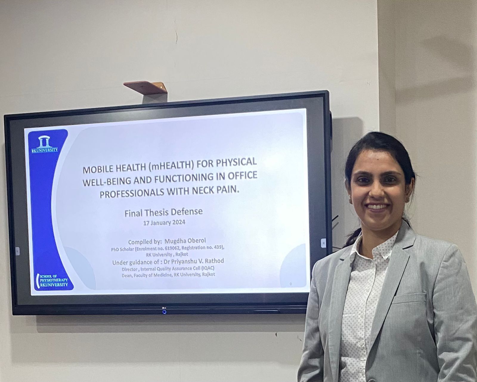 Congratulations!! Dr Mugdha Oberoi On Successful Completion of PhD in Physiotherapy from RK University Research Topic: MOBILE HEALTH (mHEALTH) FOR PHYSICAL WELL-BEING AND FUNCTIONING IN OFFICE PROFESSIONALS WITH NECK PAIN.